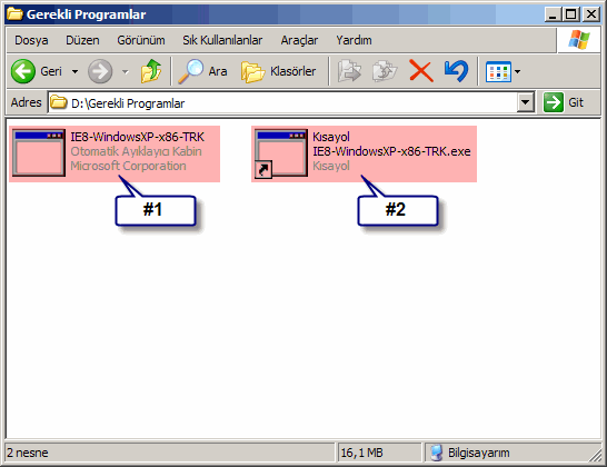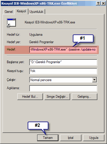 Farenizi Internet Explorer 8 kurulum dosyasının üzerine getirin ve farenizin sağ tuşuna tıklayın (Resim A #1), açılan menüde Kısayol Oluştur seçeneğine tıklayın. Kurulum dosyasının yanında bir de Kısayol IE8-... isimli bir dosya olduğunu göreceksiniz (Resim A #2). Farenizi yeni oluşturduğumuz bu dosyanın üzerine getirin ve farenizin sağ tuşuna tekrar tıklayın! Açılan menüde Özellikler seçeneğine tıklayın. Gelecek olan pencerede, sol yanında Hedef: yazan bir kutucuk göreceksiniz (Resim B #1). Bu kutucuğun içerisinde kurulum dosyasının bulunduğu yol bilgisi olmaktadır! Yol bilgisinin sonuna bir boşluk bıraktıktan sonra sihirli parametreleri yazın! Daha önce açılan pencerenin altındaki Tamam düğmesine tıklayın (Resim B #2)! İşlem tamamlandı. Artık tek yapmanız gereken yeni oluşturduğunuz ve sihirli parametreleri girdiğiniz kısayol dosyasına fareniz ile çift tıklayıp çalıştırmak!