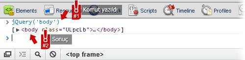 Aşağıdaki resimde jQuery ve tarayıcı konsolu etkileşimini görebilirsiniz