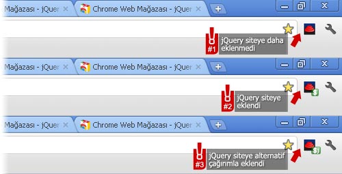 Üzerine tıkladığınızda #2 numaralı kısımdaki gibi bir hal alacak ve jQuery siteye dahil edilmiş olacak
