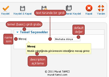 Dikkatiniz çekmiş olabilir label ve description alanlarında TPL_TEMAM_SLOGAN ve TPL_TEMAM_SLOGAN_ACIKLAMA kullanıldı. Buraya direk birşeyler yazılabilirdi. Fakat biz dil desteği sağlamak için dil dosyası içindeki ANAHTARları kullandık. Böylece o kısımlar Joomla tarafından otomatik olarak dil dosyasındaki anahtarlar karşısındaki değerler ile değişecektir. Bu tür bir yapı aşağıdaki gibi bir çok alanda kullanılabilir.