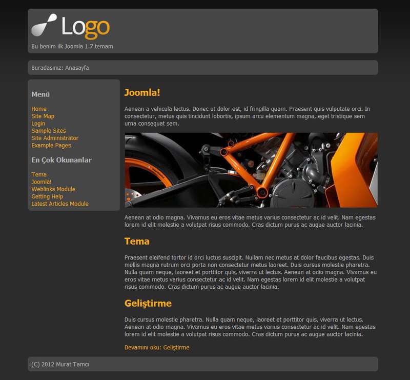 Bu yazı her ne kadar Joomla 1.7 ve üst sürümler için olsa da 1.5 sürümü ile mantık aynıdır. Eklenti bilgilerinin bulunduğu XML dosyasında bazı düğümler farklıdır sadece. Yazı sonunda ulaşacağınız tema aşağıdaki gibi görünecektir.